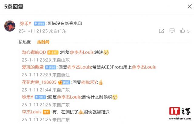 一加李杰:“春节水印”功能正在测试中,可以快速推送。