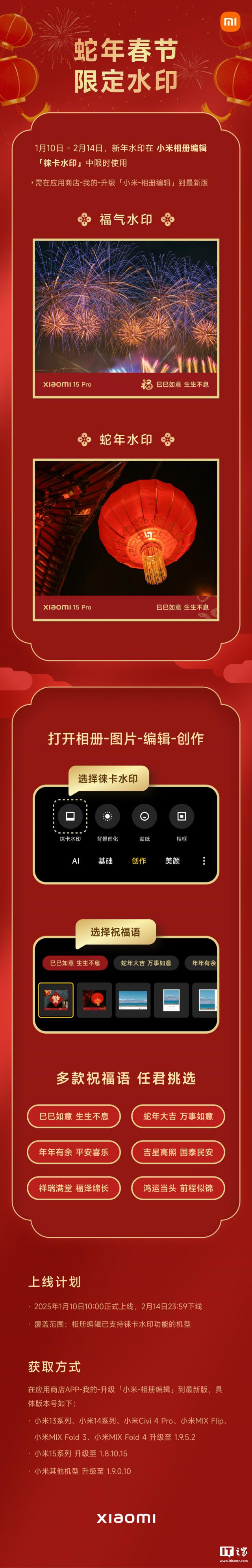 另外,小米已经是本周了(1) 月 10 第一天)宣布“蛇年春节水印”, 月 10 日 -2 月 14 每天限时上线,提供祝福词选择使用,覆盖范围包括已经支持徕卡水印功能的相册编辑机型。