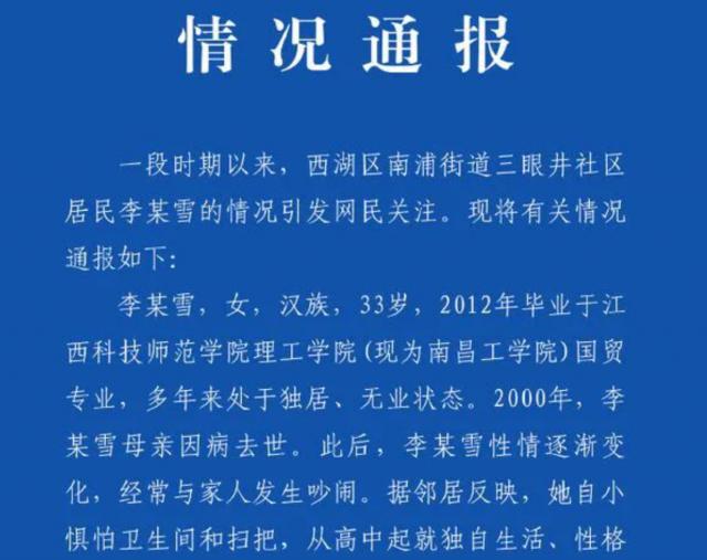 最近,江西南昌一位自称“李宜雪”的网友引起了网络的关注。 月 11 日前,南昌市公安局西湖分局、西湖区南浦街道办事处发布了《情况报告》,详细介绍了有关情况。