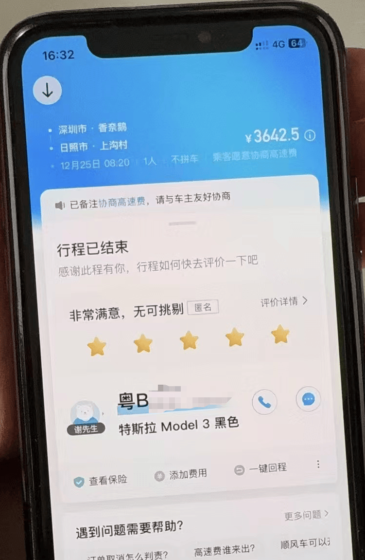 乘客在乘车时支付了3600多元,司机已经失联。