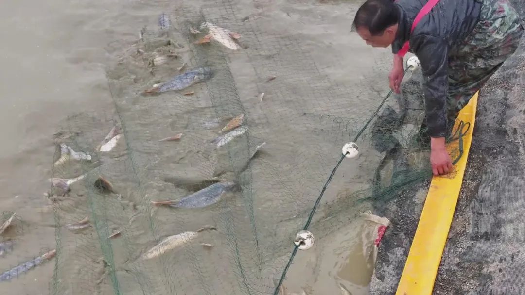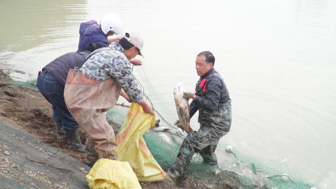 现在正是数九寒冬,在汤池镇中份村的一个池塘里,捕年鱼活动如期举行。