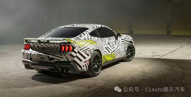 这款车有两个突出的升级设备,特别引人注目,一个用来增加下压力的固定尾翼,一套荧光黄色。 Brembo 刹车卡钳,让你一眼就知道这不是普通的。 EcoBoost 野马,这款原型车还采用了独特的伪装涂装,含有荧光黄色装饰元素。