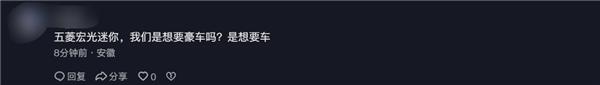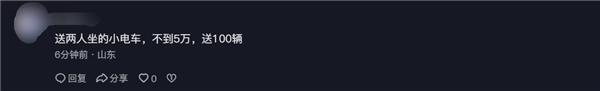 有网友在评论区留言说:“送两个人坐的小电车,不到 5 万,送 100 一辆“五菱宏光迷你,我们要豪车吗?想要一辆车”“就是车,我不挑”等等。