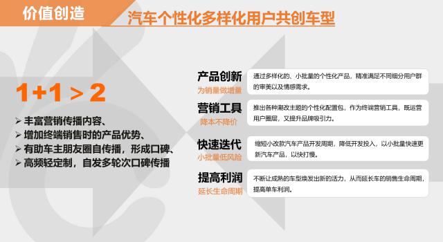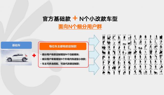 每辆车的个性化重塑可以在原有中型车型的基础上推出创新的小型改装车型。比如通过场景功能、外观内饰、衍生配件等进行重塑。,从而增加每辆车的感性价值。
