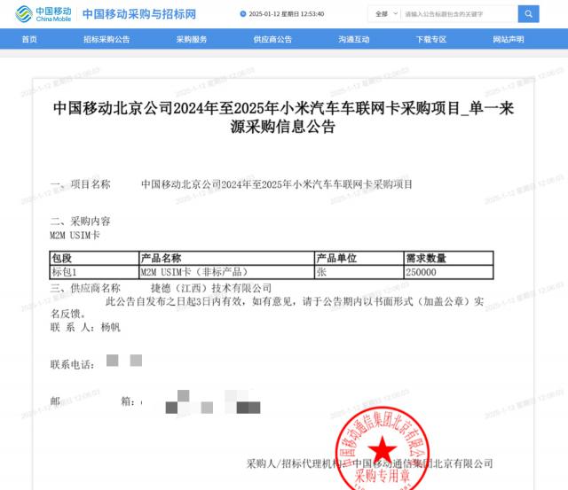 IT 世家 1 月 12 据中国移动采购和招标网报道,小米汽车已经向中国移动采购。 25 万张 M2M USIM 卡片(非标产品),供应商为捷德(江西)科技有限公司。