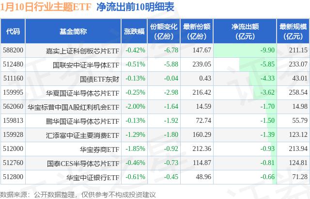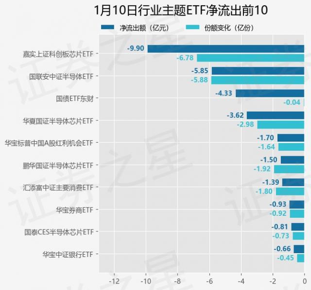 当天有 160 只行业主题 ETF 资金净流出,其中嘉实上证科技创新板芯片净流出排名第一。 ETF(588200),份额下降 6.78 一亿份,净流出额为 9.9 亿元。
