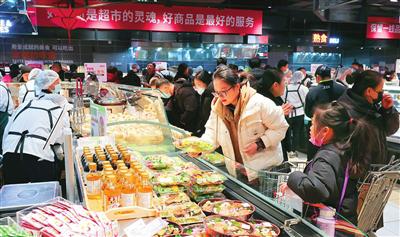 另一个受欢迎的区域是香气浓郁的熟食区。货架前,店员一边理货一边招呼顾客:“这是我们的甜肠。它在北京的调整店卖得很好。你可以试试。”张女士品尝后决定买一些。她对记者说:“我家住在机场,平时经常来永辉。这一次,我觉得变化很大,明亮多了,物品也更丰富了,尤其是熟食。”