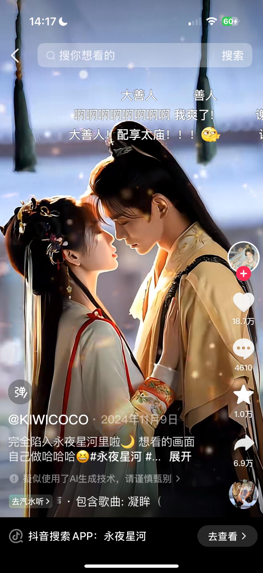 对于吸CP这件事,大家也是对AI带来的便利赞许有加。AI制作的男女主角亲吻片段在《永夜星河》热播期间,在抖音中获得了18.7万的好评。「在21世纪,我宣布AI是最伟大的发明。」评论得到了五万次赞扬。用AI为《永夜星河》写小甜歌,这是抖音剧粉丝常见的团建方式。如果技术稍微高一点,男女对唱两首情歌都不是问题。