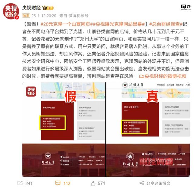 IT 世家 1 月 13 据日报报道,在昨天播出的《财经调查》节目中,央视以“克隆网站”的形式曝光了诈骗内幕。在不同的电子商务平台上,有各种官网的克隆、山寨店铺,价格从几十元到几千元不等。