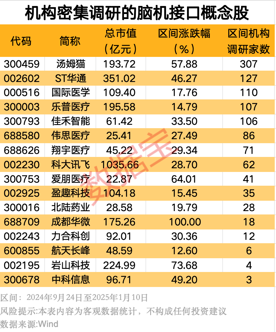 根据证券时报·数据宝的统计,自2024年9月24日起,脑机接口31只概念股全部上涨,平均涨幅超过30%。复目复华,成都华微,汉威科技,岩山科技,爱朋医疗,汤姆猫涨幅居前。其中复目复华、成都华微股价翻了一番。