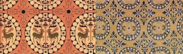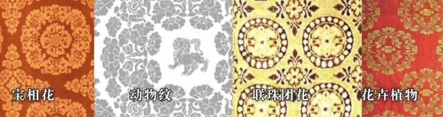 嗯,下面提到的图案大多来自“陵阳公样”。转过头来,我们再来看看。李现的衣柜,大部分都离不开这些纹路:宝花团窠纹、翼马联珠纹、对鸟团窠纹。我们把它拆开,婴儿花,翼马,对鸟全部为中心图案,团窠、联珠是外围图案的主体。