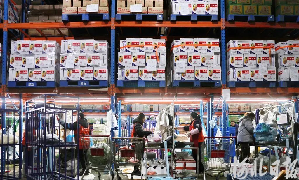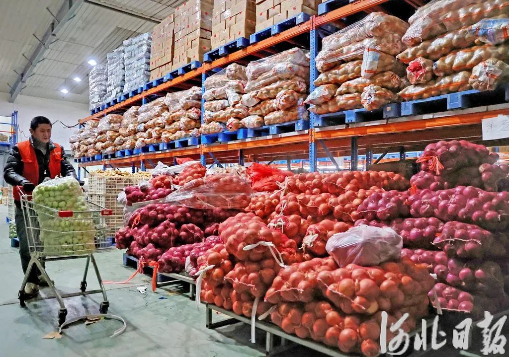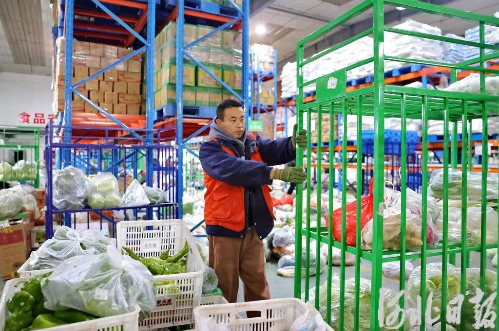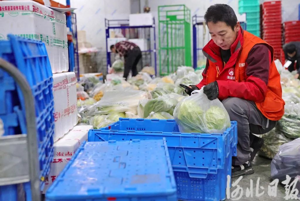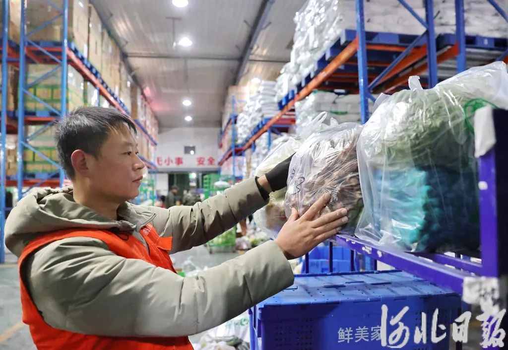 秦皇岛海港经济开发区美味家电商务秦皇岛有限公司分拣中心,工人们对蔬菜进行分拣和包装。