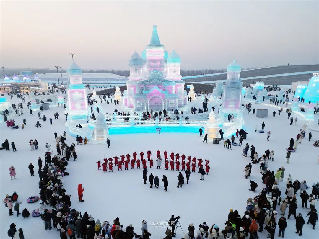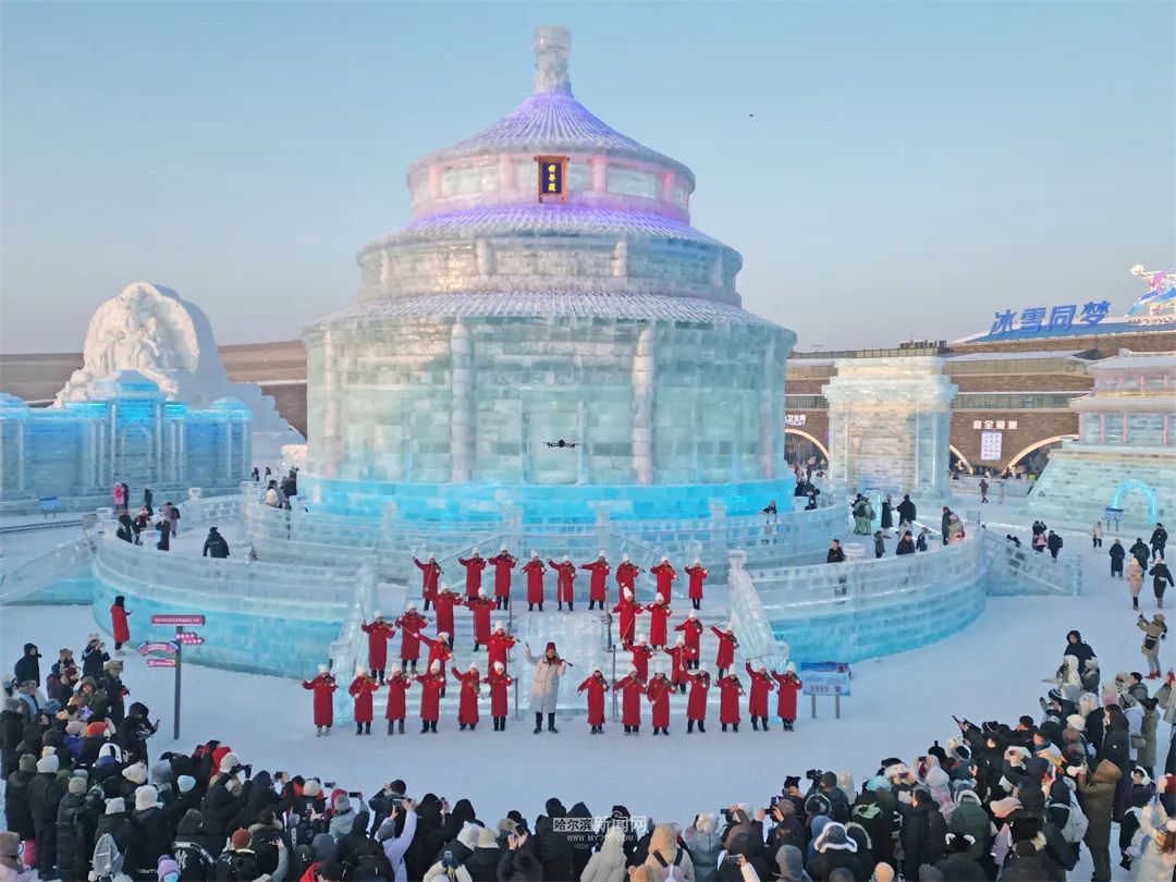 活动当天,冰城天朗气清,哈尔滨冰雪新天地犹如童话中的冰雪帝国,美丽的冰雪景色在阳光下熠熠生辉。在第26届哈尔滨冰雪新天地天坛冰建景观之前,璀璨的灯光被照亮。薛苏里和35位小提琴演奏者一起演奏了《龙的传人》和《歌唱祖国》。在充满祝福和深情的激昂音符从弓弦中涌出,瞬间引起了现场游客的注意。每个人都沿着音乐的声音聚集,沉浸在美妙的旋律中。巧夺天工的冰雪美景与优美的小提琴音乐相得益彰,使整个园区充满文艺范儿。在这场惊艳的表演中,游客们感受到了哈尔滨“世界音乐之都”的文化底蕴,感受到了哈尔滨“冰雪文化之都”的独特风格。演奏结束后,现场掌声热烈,欢呼声此起彼伏。