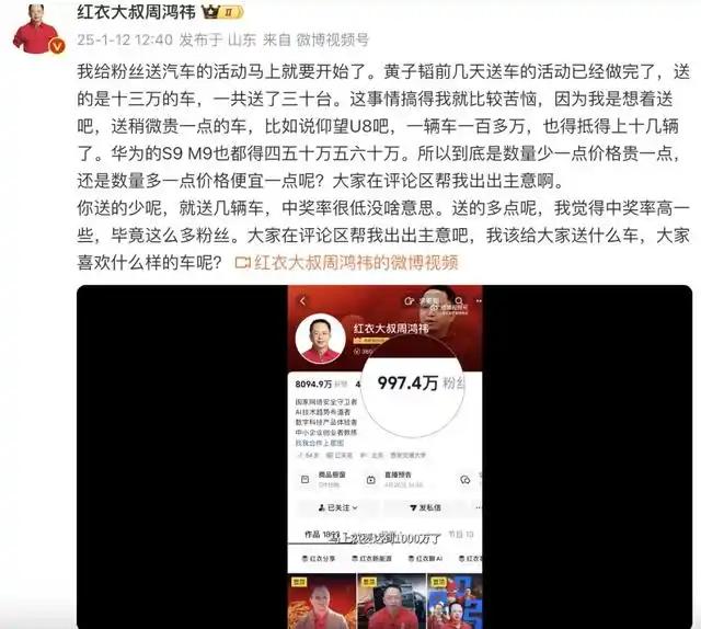 录像中,周鸿祎说:“黄子韬前几天送车活动已经完成,送的是13万辆车,总共送了30辆。这件事让我很苦恼,因为我想送,送稍微贵一点的车,比如仰望U8,一辆车100多万,值十几辆。华为S9、M9也要四五十万,五六十万。所以到底是数量少一点价格贵一点,还是数量多一点价格便宜一点?每个人都在评论区帮我出主意啊。”