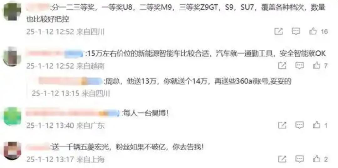 周鸿祎的言论迅速引起了网友的热烈讨论。很多网友在评论区积极提出建议,也有建议设置不同级别的奖项,覆盖各种级别的车型;有人认为选择性价比高、安全智能的新能源汽车更合适;有人开玩笑说送1000辆五菱宏光车,粉丝数量可能会超过1亿。
