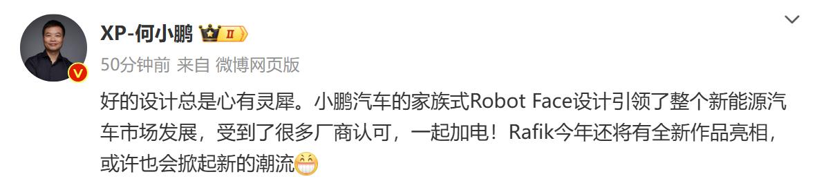 对此,小鹏汽车CEO何小鹏似乎没有任何意见,认为“好的设计总是心心相惜”。