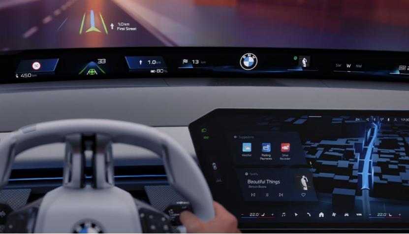 CES中的宝马 宝马全景是2025年全球首发的全新汽车系统。 iDrive,其核心亮点之一的视平线全景显示,其显示区域覆盖了挡风玻璃底部约80%的宽度。利用超近距离投影技术,将信息投射到挡风玻璃下部的黑色涂层上,取代传统仪表板,为驾驶员提供了比传统仪表板近三倍的信息展示空间。驾驶员侧面显示关键数据,如速度、速度、续航里程等。,而中央和乘客侧区域可以根据自己的需要定制显示内容,如实时导航路线、多媒体列表、车辆状态监测信息等。