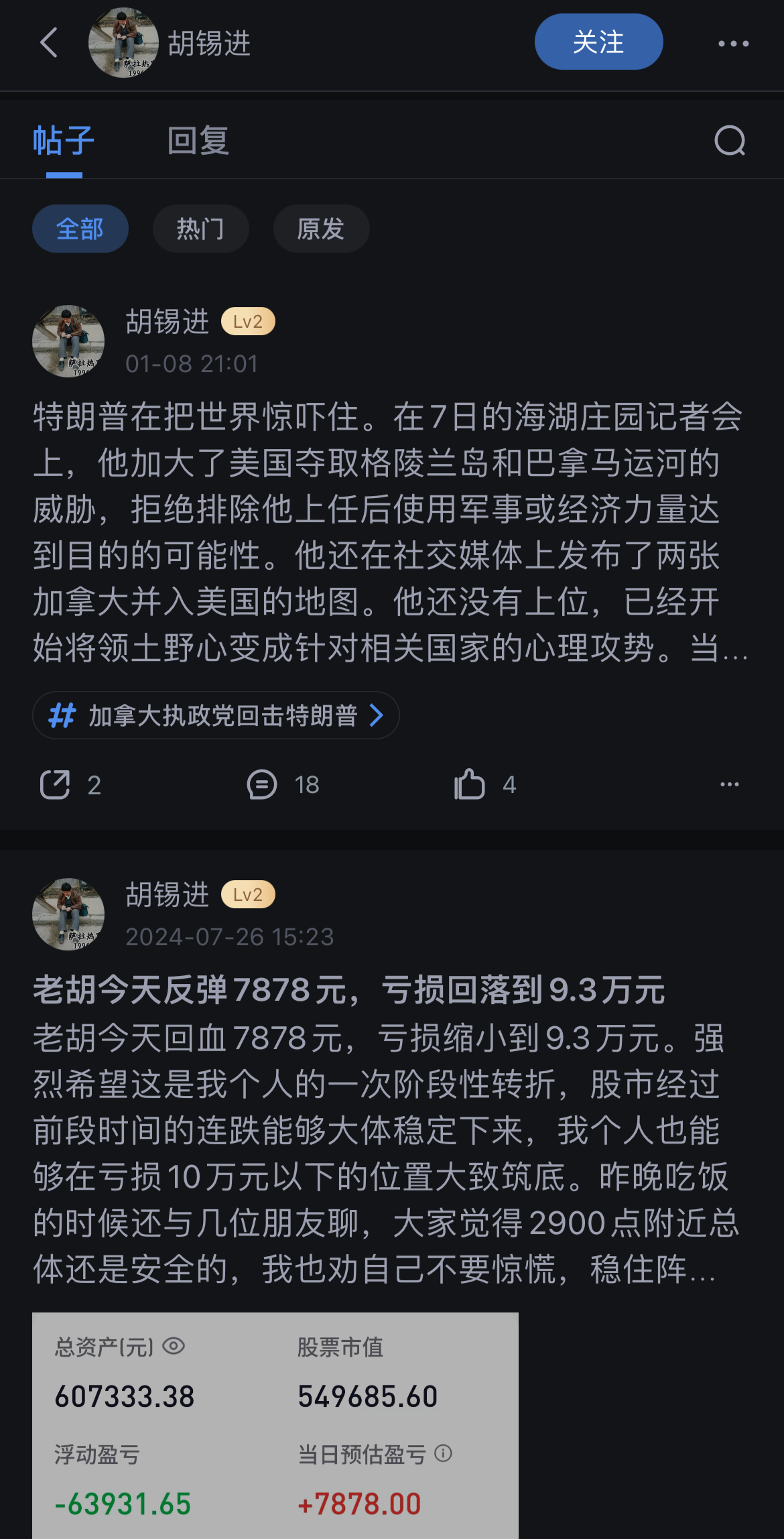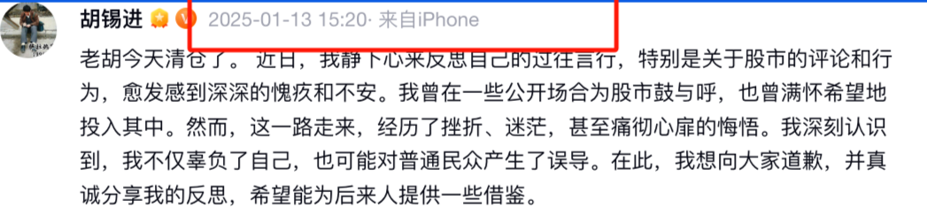 通过进一步整理相关线索,我们可以发现“胡锡进财经栏目”这个账号最早的发布时间只有1月8日,而胡锡进自己在社交平台上的最新动态更新是在事件发生前21分钟。其账户始终保持正常的更新频率和活跃状态,与所谓的“清仓道歉”明显不符。