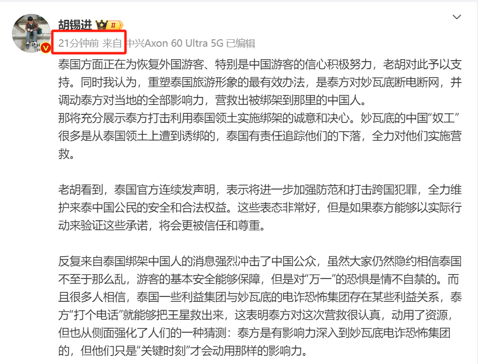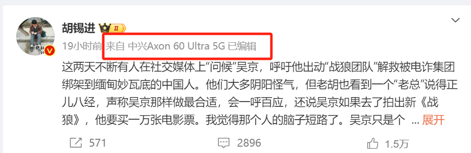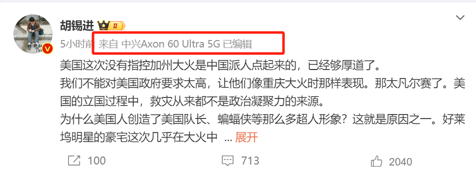 更重要的是,网络爆炸图片中的发布设备暴露了疑问。根据图片,发布“道歉声明”的设备是“iPhone”。不过,胡锡进此前在社交平台上的发文记录显示,他一直使用国产品牌“中兴Axon60Ultra5G”手机。这个关键细节的不同,进一步证实了网络爆炸图片的内容存疑。