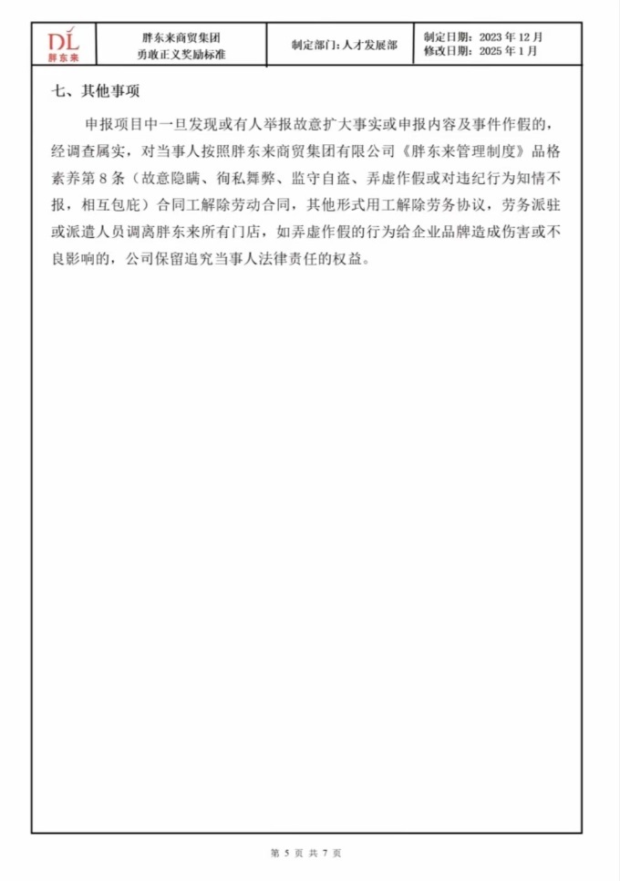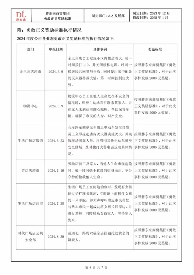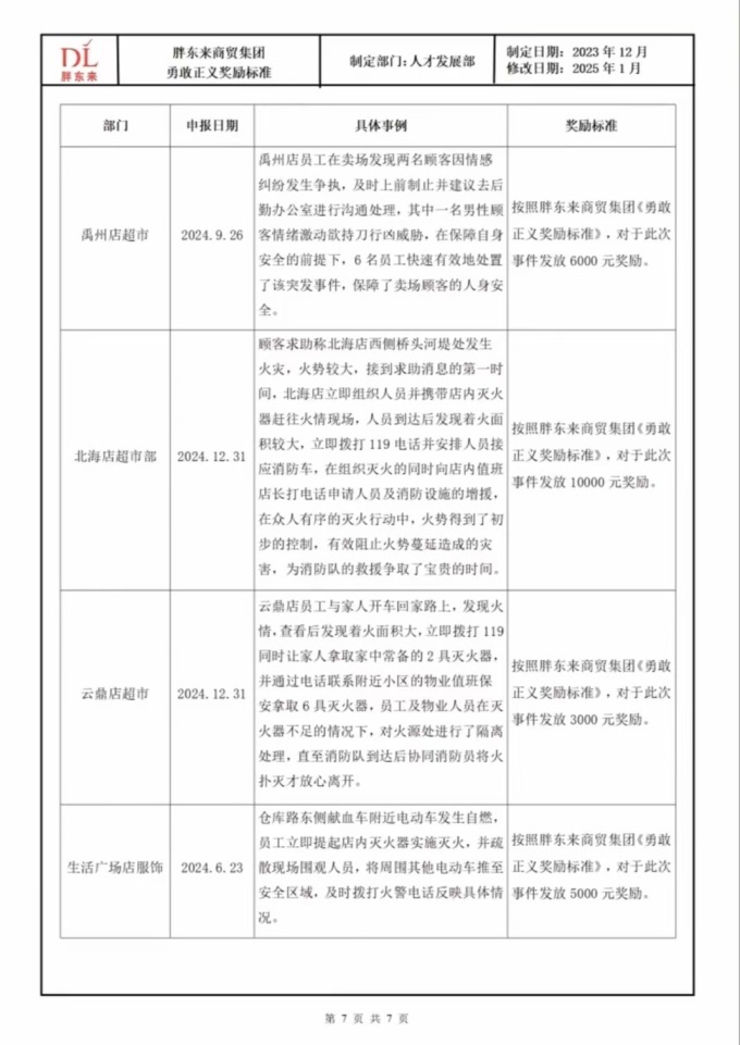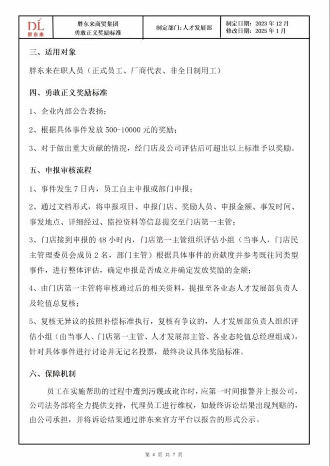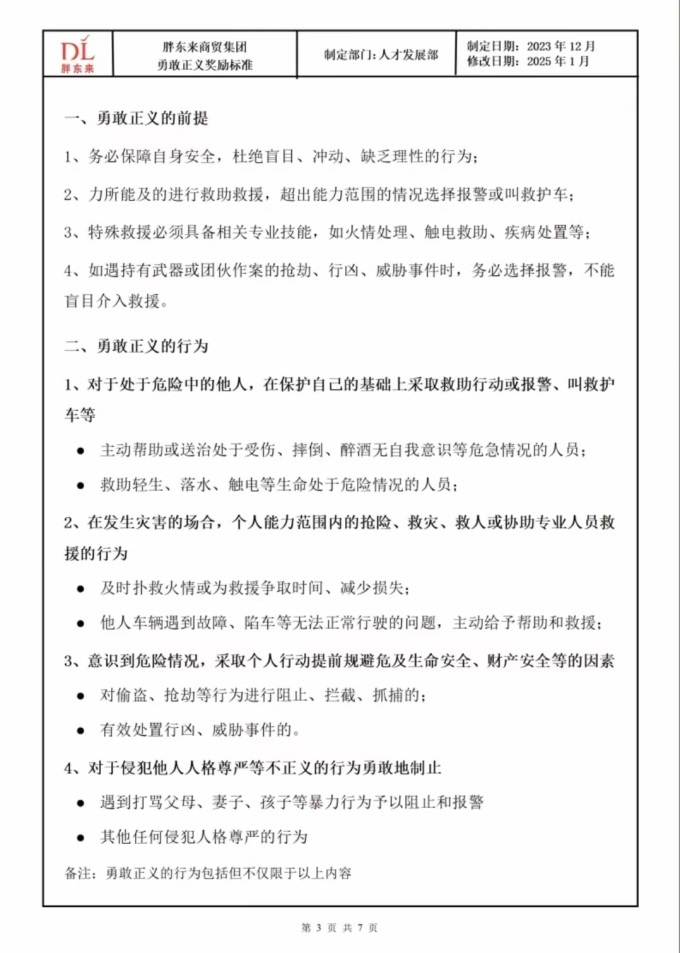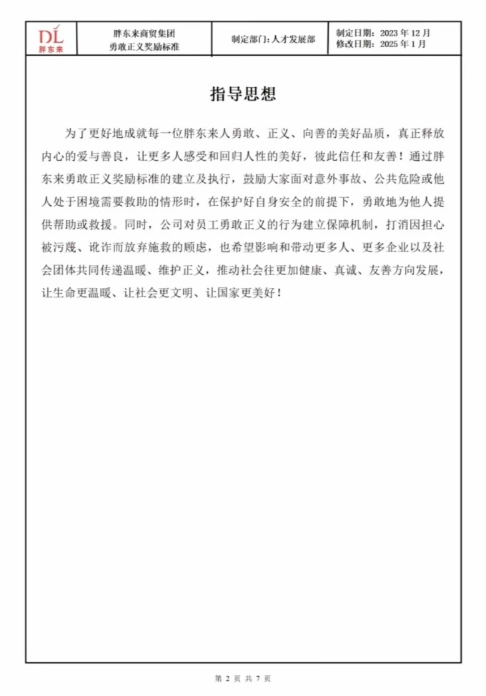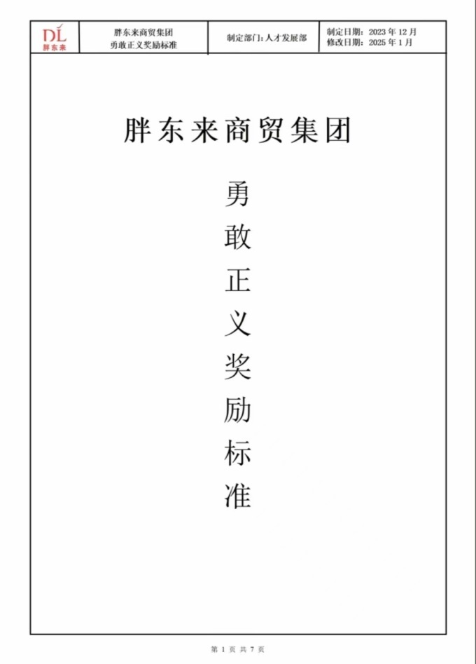 《胖东来贸易集团勇敢正义奖励标准》旨在更好地实现每一位胖东来人勇敢、正义、善良的美好品质,真正释放内心的爱和善良,让更多的人感受到和回归人性的美好,相互信任和友好。