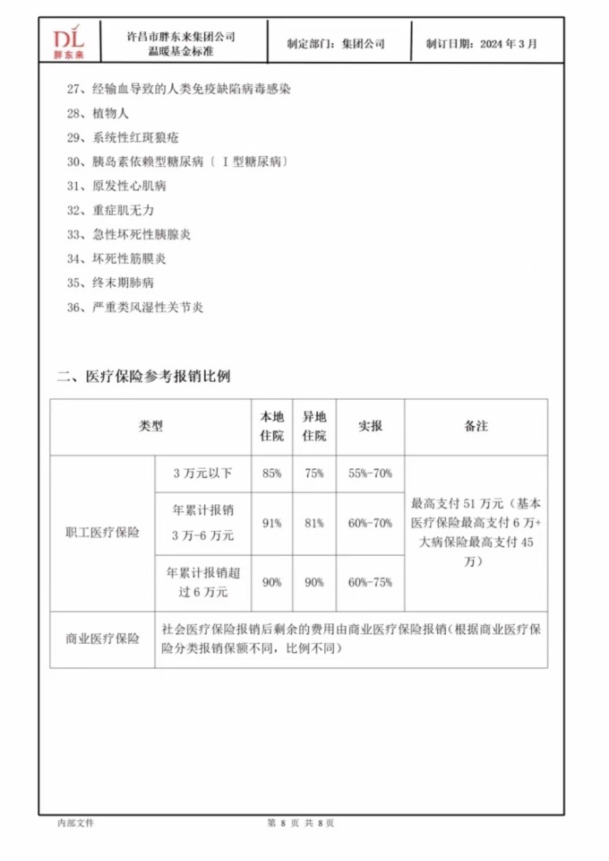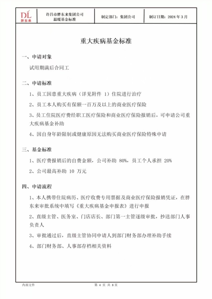 通过规范员工基本保险,提高员工抵御风险的意识和能力,胖东来可以更理性、更冷静地面对和处理突如其来的重疾和事故。通过成立胖东来温暖基金,员工可以在面对这种重大医疗风险时得到更有效、更有力的保障,缓解心理压力,解决后顾之忧。