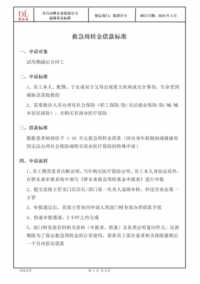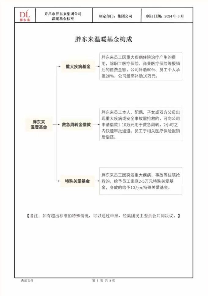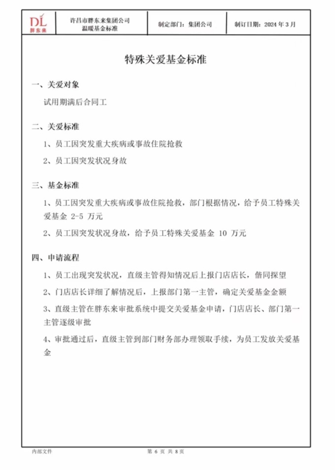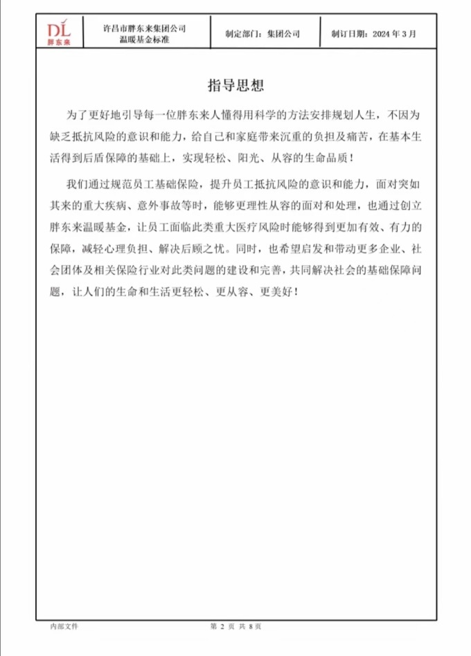 《胖东来贸易集团温馨基金标准》的发布,是为了更好地引导每一位胖东来人懂得如何用科学的方式规划自己的人生,在基本生活得到后盾的基础上,实现轻松、阳光、从容的生活品质,而不是因为缺乏抵御风险的意识和能力,给自己和家庭带来沉重的负担和痛苦。