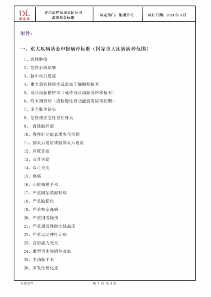 根据东来哥发布的内容,胖东来温暖基金包括三个项目:大病基金、应急周转基金贷款和特殊护理基金,其中36个项目列出了大病基金申报的疾病标准。