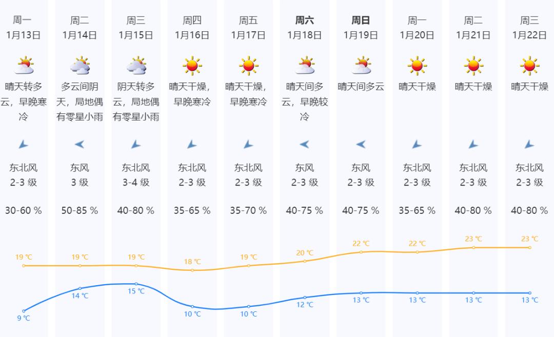 一月十三日,晴天转多云,早晚严寒,气温9℃-19℃;东北风2-3 等级;30-60的相对湿度 %。