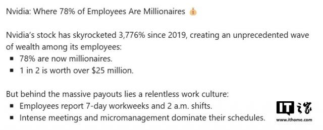 报告称英伟达 78% 员工已经成为百万富翁,但是面对高压工作环境