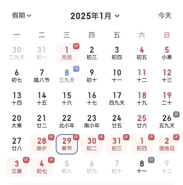 2025年春节假期:2025年1月28日(星期二)-2025年2月4日(星期二),休假8天。