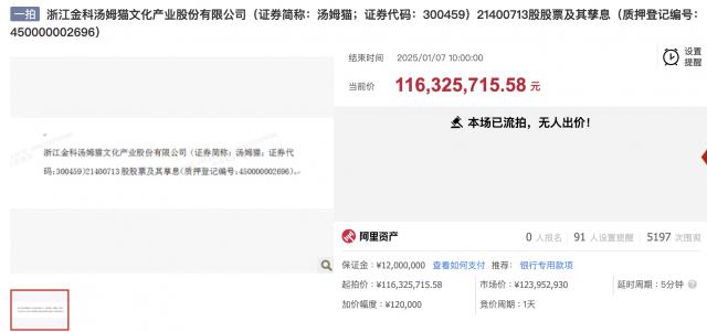 1 月 7 日本,据阿里资产拍卖显示,浙江金科汤姆猫文化产业有限公司被拍卖。