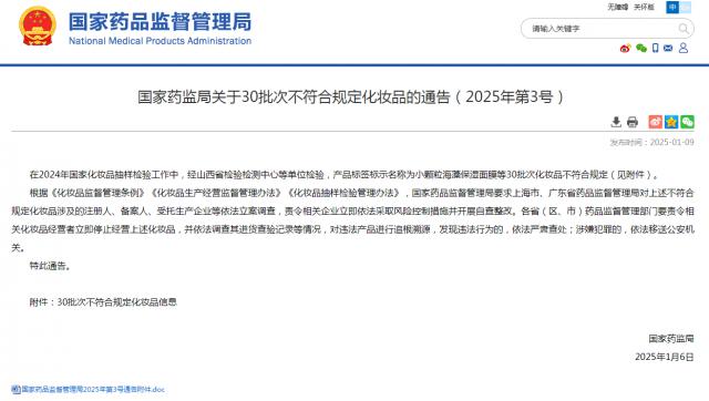 最近,国家美国食品药品监督管理局网站更新了《国家美国食品药品监督管理局关于 30 批号不符合化妆品要求的通知(2025 年第 3 号码),全文如下: