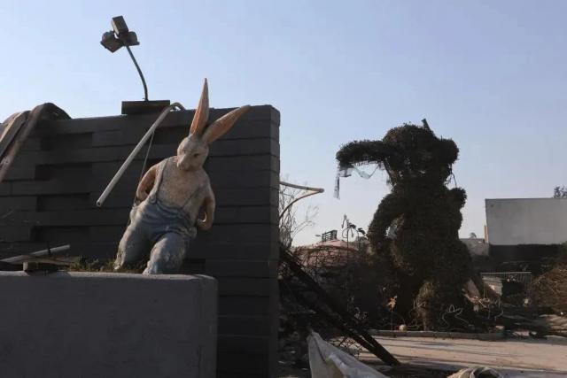 这是 1 月 10 在加利福尼亚州洛杉矶县阿尔塔迪纳拍摄的当地著名博物馆——“兔子博物馆”,日本被山火摧毁。新华社(邱晨摄)