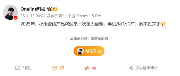 【CNMO 科技消息】2024 2008年对小米来说是一个很有里程碑意义的一年,在手机、智能家居、汽车等领域都取得了显著的成绩。但是在 2025 2008年,小米全线产品将迎来重大更新,覆盖手机,IoT(物联网)设备和汽车,博主称“数不过来”。