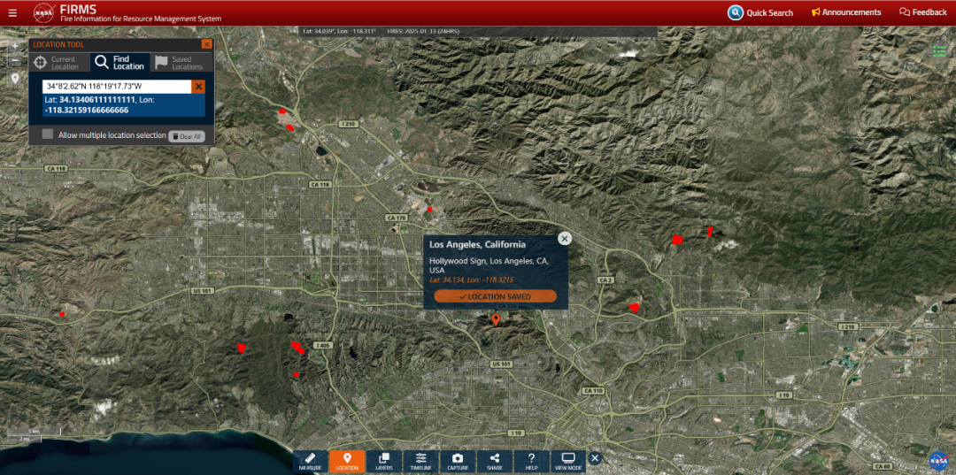 国家航空航天局(NASA)FIRMS地图中开发的全球火灾监测系统没有显示在好莱坞标志(34.134134134)° N, 118.3215° W)周围发生了火灾。