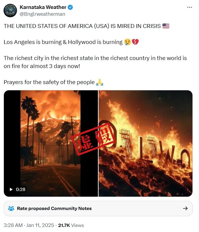 社交媒体上流传着许多声称“好莱坞巨型标志”HOLLYWOOD“被火焰吞没”的图片和视频,也被证明是假的,请注意筛选。