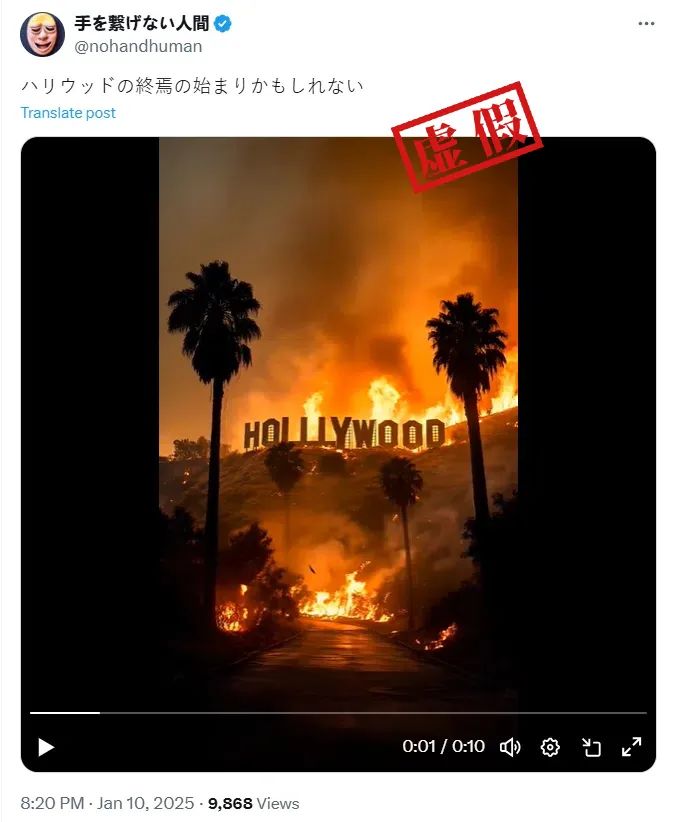 关键帧反搜发现,网络视频至少已经出现在美国西部时间1月10日凌晨。X平台账号@nohandhuman在发布这个视频后声称“这可能是好莱坞末日的开始”。