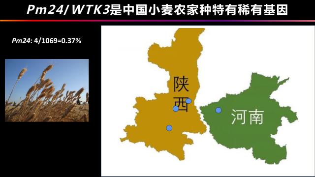 所以后来我们觉得这个基因在陕西,河南最西端,关东平原。这是中国小麦中的“中国基因”。我们说这么漂亮的基因。 这叫什么?我们认为有一种“中国美”的抗病基因。