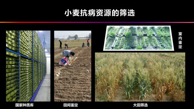 首先,我们从种子库中找出这些收集的野生小麦和农民种,从各个地方找出来,从国外收集回来,在田里种植,在温室中连接霜菌进行筛选。你可以看到我们筛选出了抗病材料,然后我们将研究它们,我们将从中找到抗病基因。