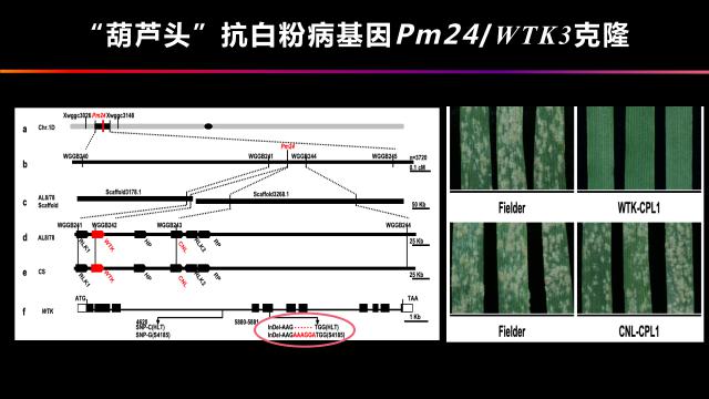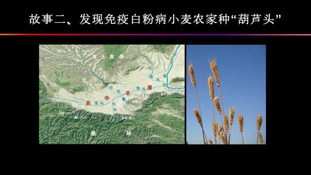 我们可以看到右边的小麦。穗就像一个叫葫芦头的小木棍,但是产量不好,长得特别高。现在我们在地里种了一会儿就倒了,但是对于中国的每一个白粉病菌,我们各省都采集了,都是免疫的,完全不能生病。我们说这个基因好,怎么才能用,让饲养员用在小麦品种上,所以我们花了十几年的时间。还把它复制出来。