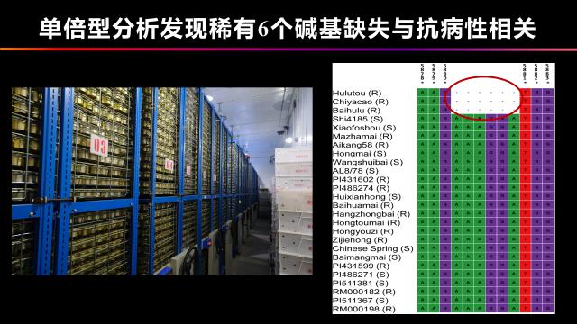 我们分析了一下,发现野生小麦中有七个抗病基因,其中一个是抗白粉病。但是,我们再来看看种植小麦,只有三姐妹,其中一姐妹,这个基因根本不存在,那就是第三类。