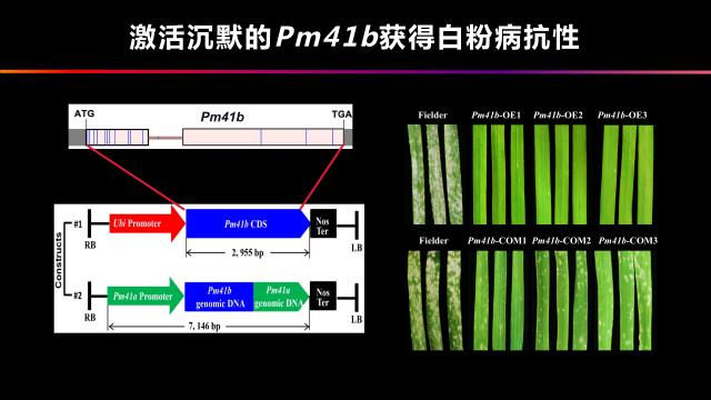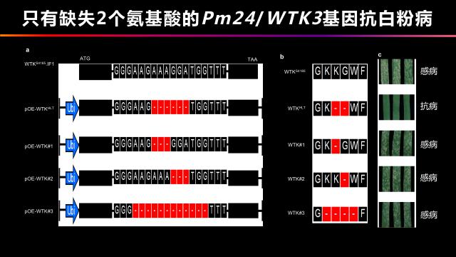 我们做了一个实验。我们取出患病小麦的完整基因,放入强制工作的载体(小麦)中。我们可以看到右边的白粉病是免疫的。这是什么意思?