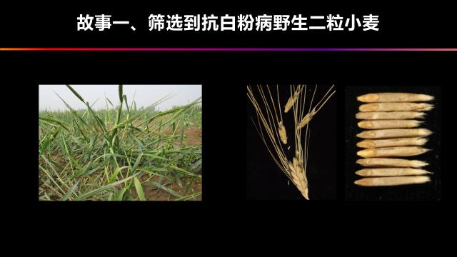 首先是我们从野生小麦中筛选出一种抗白粉病的材料,叫做“野生二粒小麦”。它不能生长。野生小麦就像杂草。它的穗长大后会怎么样?