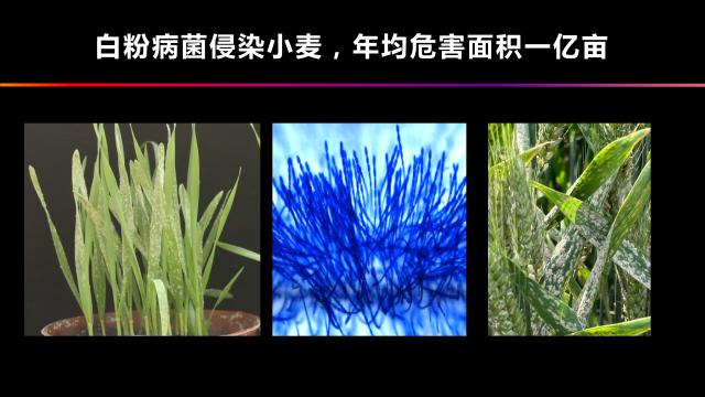 这是一种白粉病,专门用来感染小麦的疾病。你可以看到,它感染这种疾病后,真菌在叶子上,从苗期开始生长,一直生长到最后的抽穗期。