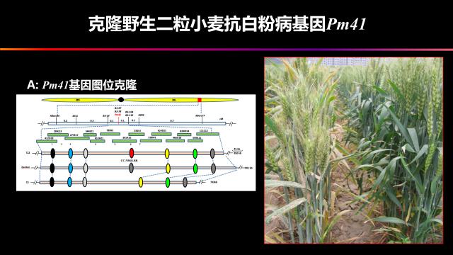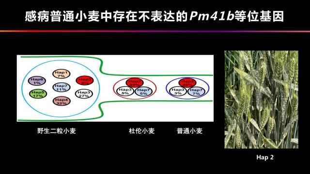 但是我们突然发现,在这种第二种小麦中,90%的感觉白粉病, 所有的小麦都有这第二种类型,第二种类型也来自野生小麦。让我们仔细看看。我们想:“你不是有这个基因吗?但是你为什么不抗病呢?”我们特别好奇,所以我们想研究一下为什么不抗病。