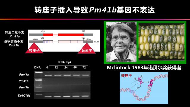 我们发现,在感染白粉病的小麦中,这种基因的前后都有这样一种叫做转座的东西,那就是弹跳基因,这使得基因停止工作。