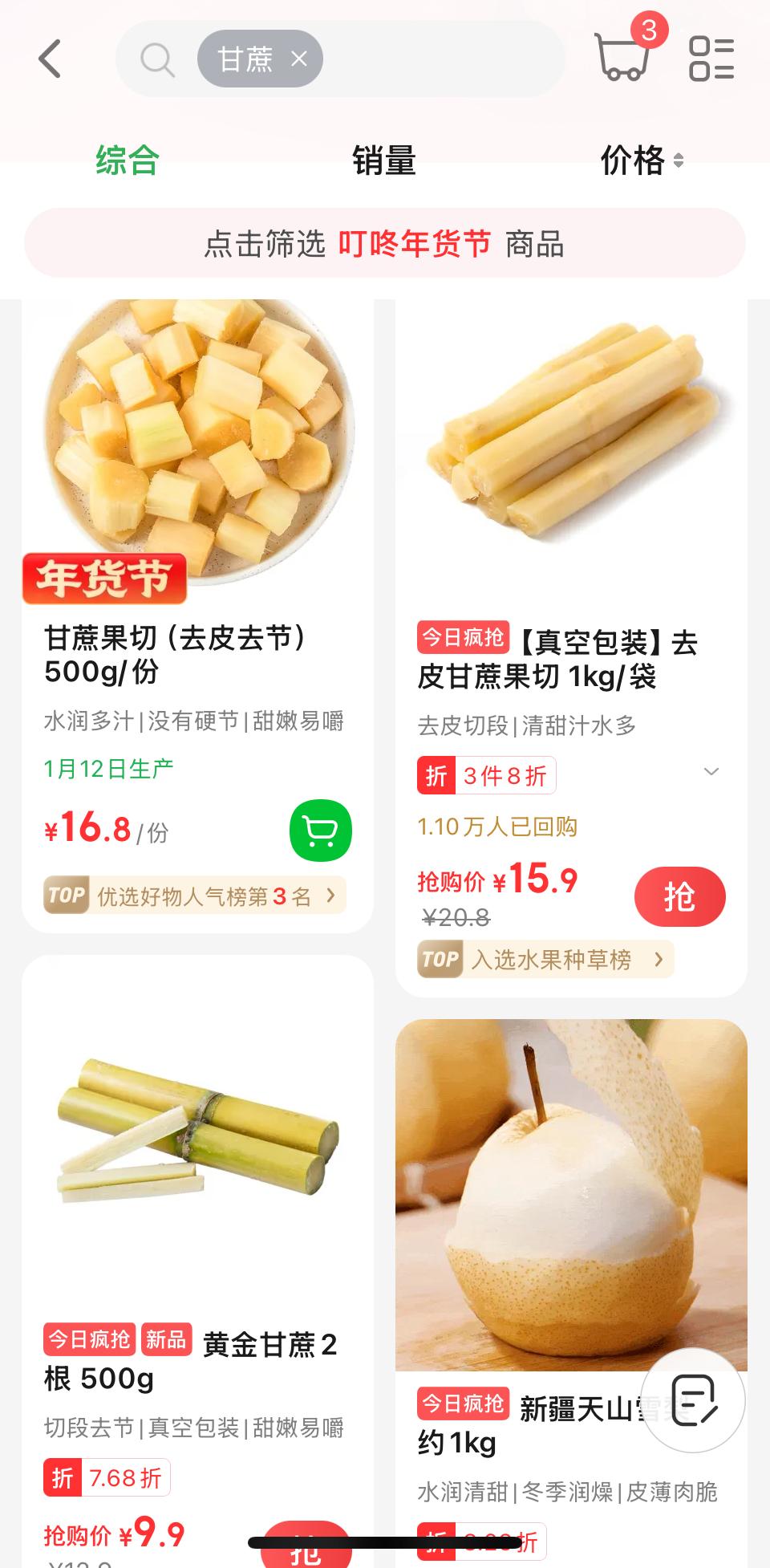 另外,记者注意到,与实体水果店不同,在生鲜平台上还提供甘蔗切割商品,方便消费者直接食用。