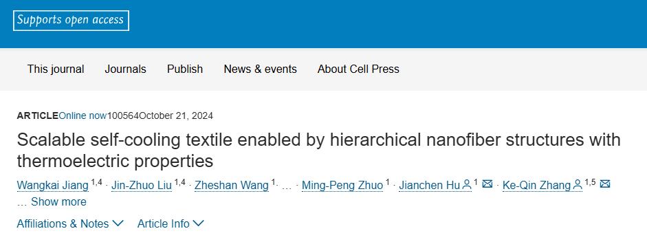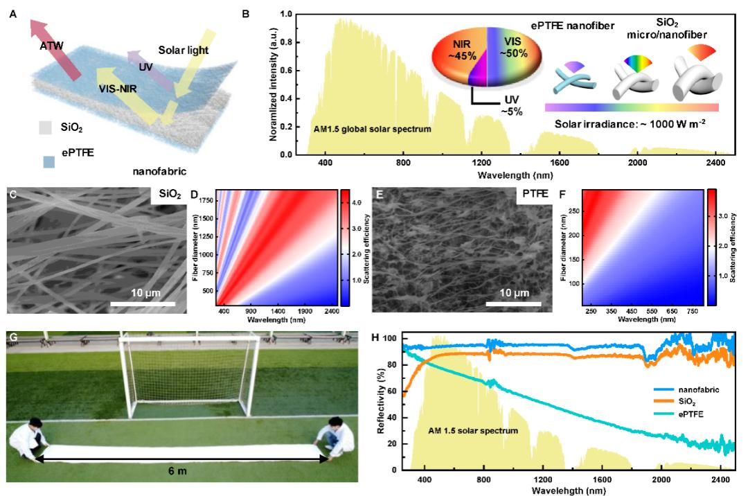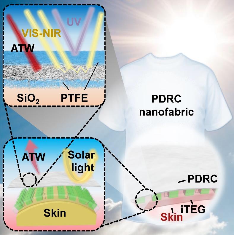 近日,苏州大学纺织与服装工程学校张克勤教授团队探索了聚四氟乙烯基于二氧化硅的纳米纤维膜和膨胀(ePTFE)新型纳米织物薄膜。作为一种具有极高太阳反射率和红外线发射率的材料,二氧化硅纳米纤维膜具有独特的纳米结构,能有效地管理织物。与此同时,ePTFE膜具有优异的耐候性和机械强度,保证了设备在各种环境条件下的稳定性。研究小组通过领先的制造工艺,成功实现了具有层次结构的纳米织物,不仅可以在高温条件下保持较低的温度,还可以在身体散发的热能和外部环境之间产生明显的温度场,从而为可穿戴热电发电设备的运行提供足够的能量支持。研究结果是“Scalable self-cooling textile enabled by hierarchical nanofiber structures with thermoelectric properties"问题出现了《Device》期刊。