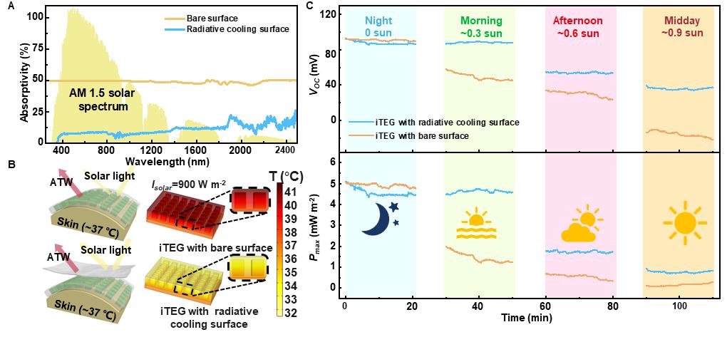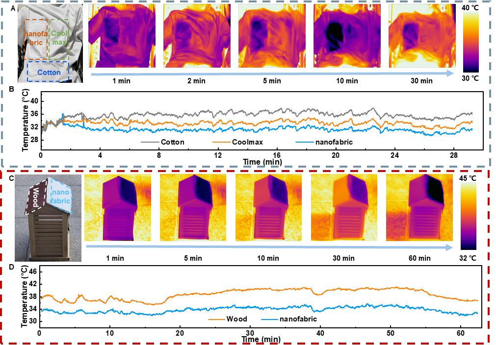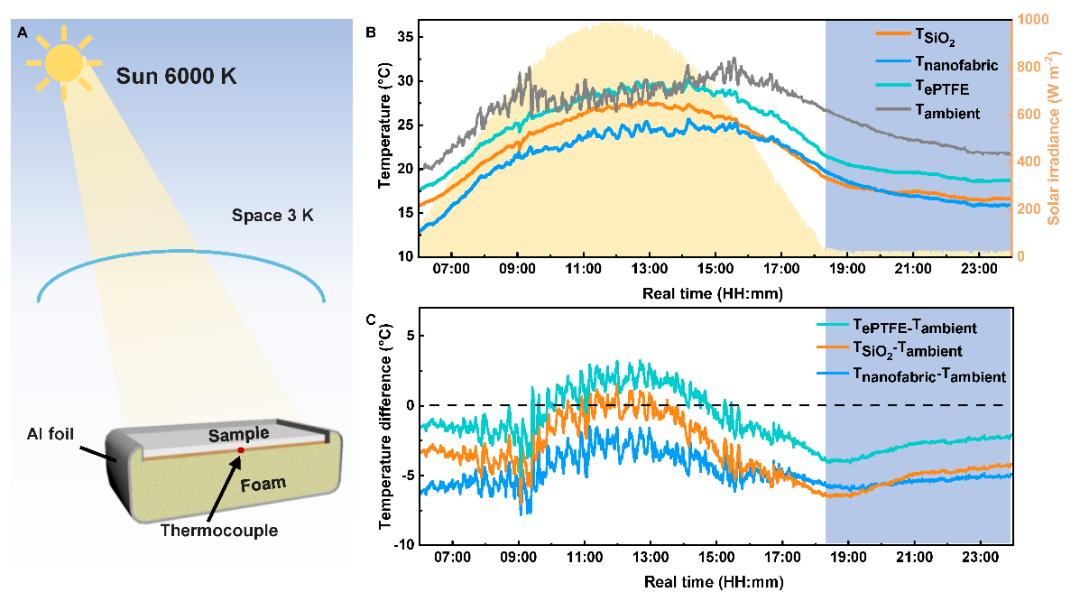 图3. 纳米织物的室外辐射制冷性能。