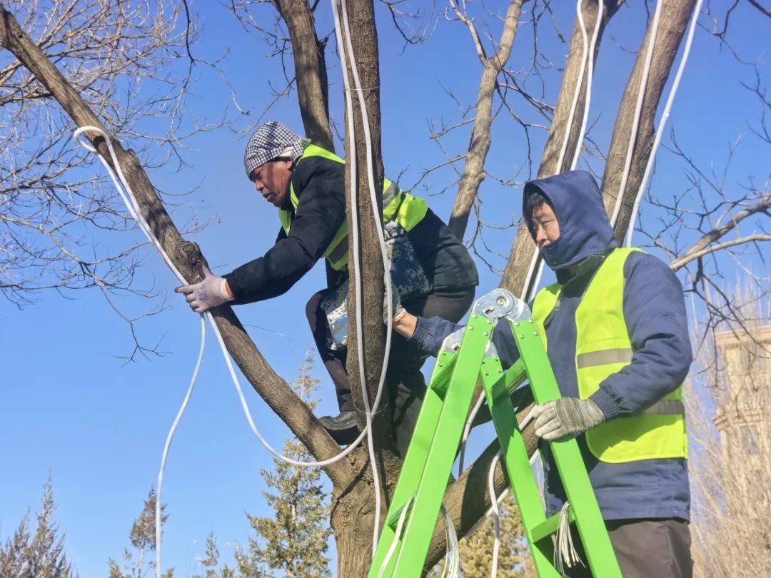 鄂托克前旗全面启动2025年春节道路亮化工作,让群众在片片光影中感受到浓浓的年味,领略城市的光影魅力。在苏力迪西街、川北路、公园路等街道上,挂灯现场一片繁忙,工人们穿着安全工作服,一丝不苟地进行着每一项照明工作。有的工人站在高高的梯子上,小心翼翼地挂着各种形状的灯,比如红灯笼、藤球、满天星;有的工人在地上整理线路,连接灯串,调整灯带,为即将到来的春节增添红火的色彩。
